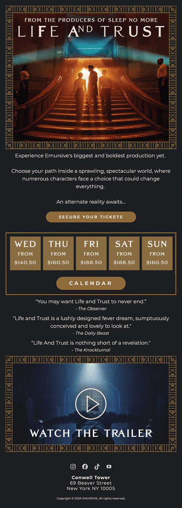My team and I developed a multi-layered campaign for Life and Trust that extended well beyond traditional email and social media. We created immersive touchpoints like an in-world newspaper to be placed in Conwell Coffee Hall, authentic banking documents such as slips and business cards, and even a character quiz that let guests discover which figures from the show they most resembled. The logo was added to a massive painted mural in the cafe